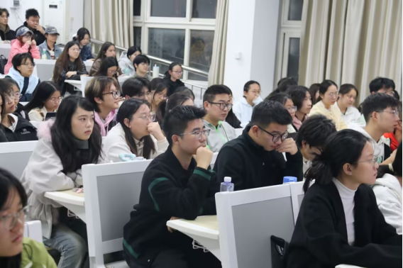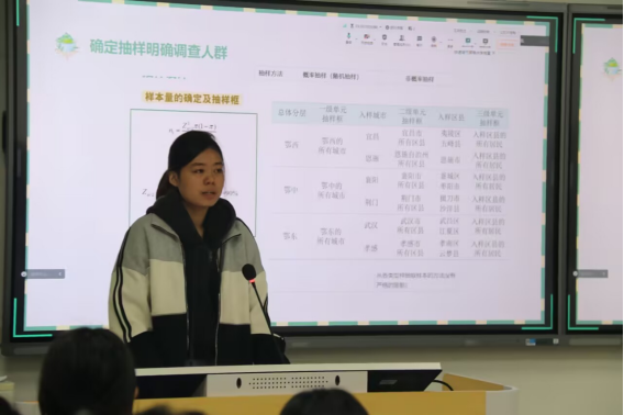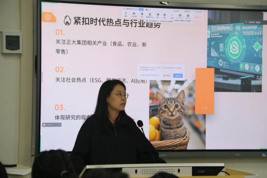 李袁梦老师则从方法论层面作了专业指导。她强调,优秀的项目始于精准的选题与破题,应遵循“小切口,深分析”原则,兼顾时代热点、数据可得性与项目创新性。她还结合案例,对市场调查中的抽样、问卷、数据分析及答辩准备等关键环节进行了深入讲解,助力同学们构建系统的备赛思维。
