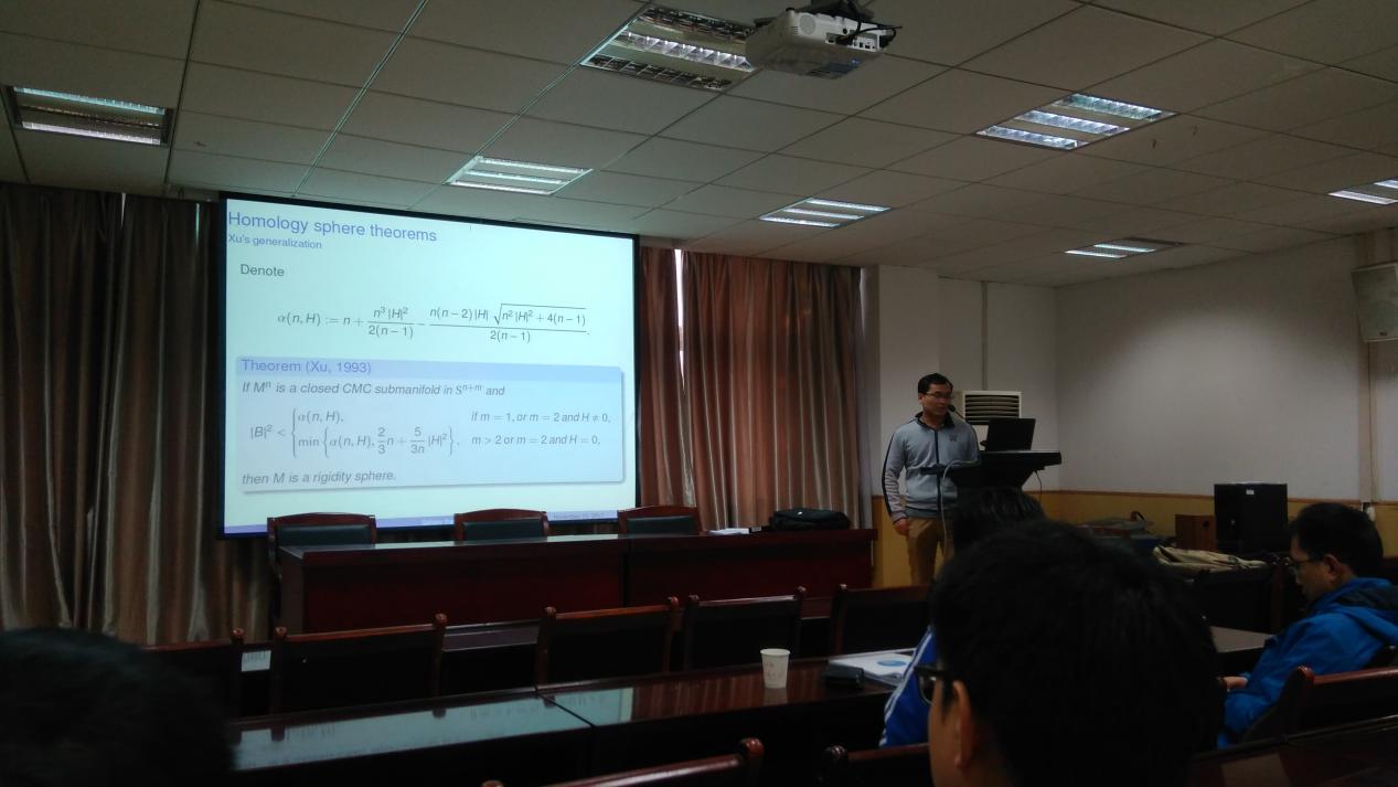 孙林林博士毕业于德国莱比锡大学,马普应用数学研究所以及武汉大学,师从Juergen Jost教授与陈群教授。本次报告内容主要是通过Ricci流,介绍了一些新的内蕴和外蕴微分球定理。