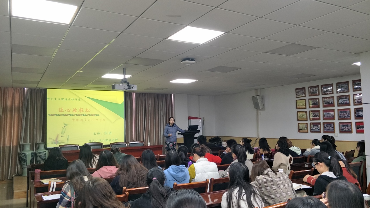 11月21日下午,在数统院201报告厅举行了研究生心理健康讲座,本次讲座由beat365官网登录中文心理健康中心的张玥老师主讲,主题为“让心放轻松”。