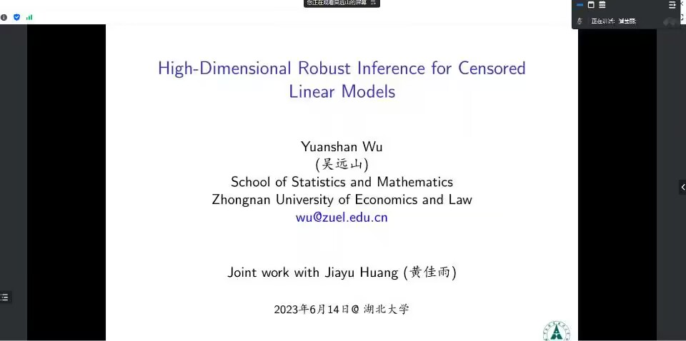 2023年6月14日下午,中南财经政法大学吴远山教授应邀为公司相关专业的教师与研究生作了题为“High-dimensional robust inference for censored linear models”的线上学术报告。