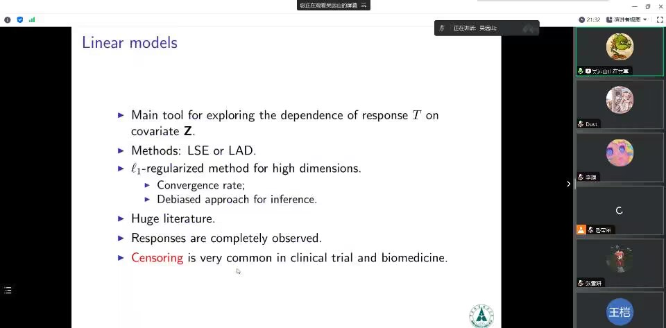 报告中,吴教授首先回顾了生存分析中完全随机删失,随机删失和非随机删失机制,介绍了常见的AFT 模型,然后引入了AFT模型下的rank-based 高维统计推断问题。在对参数进行统计推断时,通过使用U统计量理论,克服了损失函数的非光滑性带来的挑战,并建立了正则化估计量的收敛速率和提出的去偏估计量的渐近正态性以及渐近方差估计的相合性。