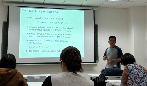 报告中,周斌教授首先介绍了复Monge- Amp\`ere方程的一些基本性质和Dirichlet问题H\"older正则性的相关结果,然后阐述了在复空间的严格拟凸域或Kahler流形上H\"older连续性的证明思路和关键步骤。报告最后,周斌教授就证明的方法和未来的发展与大家展开了热烈的讨论。大家都表示表示报告内容详细易懂,对该问题有了更深入的了解,拓宽了视野。