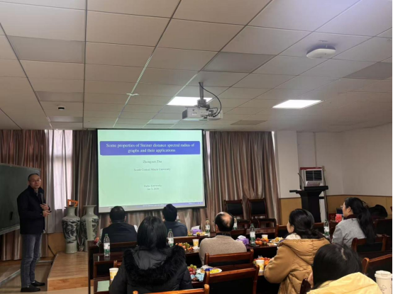 中南民族大学朱忠熏老师的报告题目是《Some properties of Steiner distance spectral radius of graphs and their applications》。朱忠熏老师首先向大家介绍了Steiner距离、Steiner距离张量(Steiner distance tensor)以及Steiner距离谱半径的相关概念与研究背景,接着向大家报告了他们团队关于Steiner距离谱半径的性质及其应用的最新研究成果。朱忠熏老师的讲解深入浅出,逻辑严密,极大拓宽了在座师生的学术视野,为大家在图谱理论的研究带来了很多宝贵的启示。