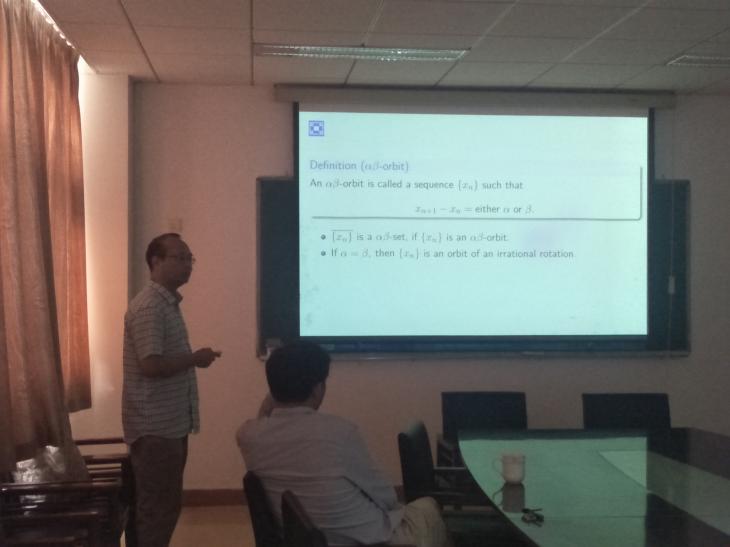 熊教授谈到了αβ集与αβ轨道等相关问题以及其拓扑结果与维数结果。其精彩的内容引起了在场师生的极大兴趣。报告结束后,熊教授与在场的师生对于报告的内容进行的深入的讨论交流,大家都表示获益匪浅。