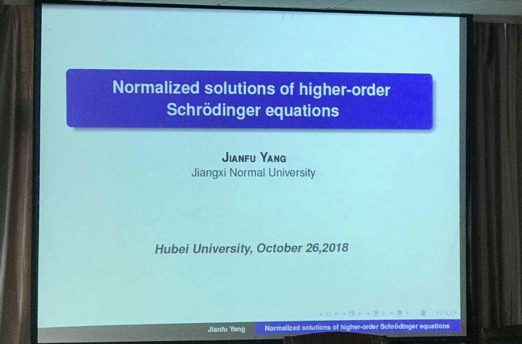 2018年10月26日下午,江西师范大学杨健夫教授应邀来访公司,并为相关专业的教师与研究生做了题为“Normalized solutions to higher-order Schrodinger equations”的学术报告。