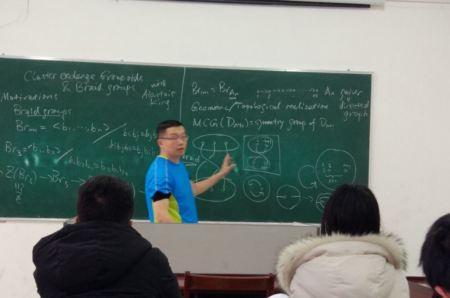 邱宇博士从组合的观点出发,深入浅出地介绍了Braid group、Cluster exchange groupoids与quadratic differential的最新结果,并分享了他的学习、教学与科研心得。报告会极大鼓舞了青年教师与代数学方向研究生的学术热情,使大家受益匪浅。