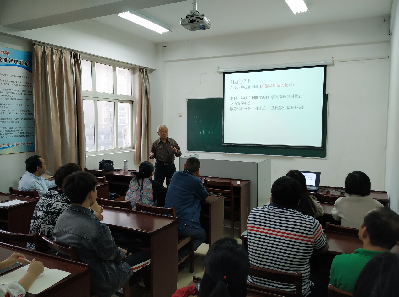 施教授做了题为“有限单群的数量性质”的报告,报告首先通过个人的亲身经历,以反函数的积分以及元素阶等具体例子讲解了在数学研究中如何学会提出问题和解决问题。然后对比群的阶考虑群中元素的阶的集合,给出了用元素的阶刻画群结构的一些理论,并提出几个待解决的问题。最后施教授给予了师生一些关于学术研究的建议和鼓励。