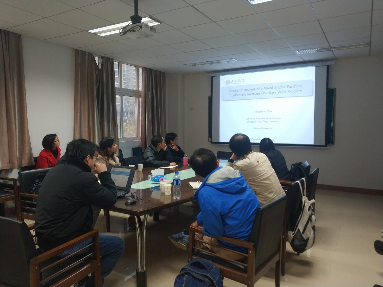 朱苗苗教授的报告题目为“Geometric Analysis of a Mixed Elliptic-Parabolic Conformally Invariant Boundary Value Problem”。报告中,朱教授介绍了与Geometric Analysis of a Mixed Elliptic-Parabolic Conformally Invariant Boundary Value Problem相关的一些问题,向我们讲解了对源自QFT非线性超对称sigma模型的变分问题进行几何分析的系统处理。