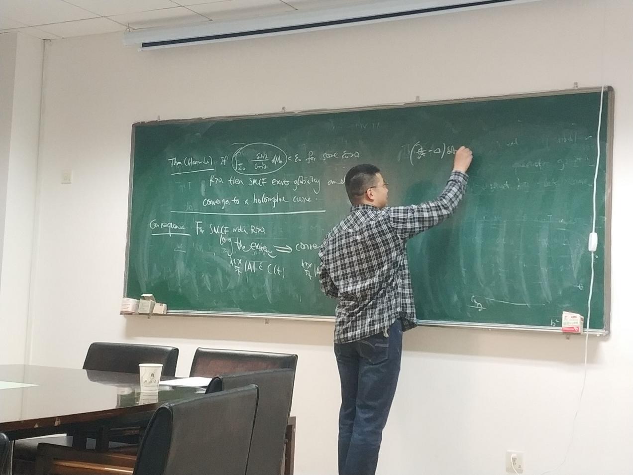 在报告中,孙教授介绍了他和合作者在辛平均曲率流、Lagrange平均曲率流长时间存在性、收敛性方面最新的研究成果,并谈及了可能的应用。最后,孙教授对与会师生的疑问一一进行了解答。