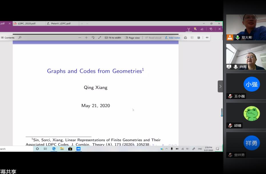 2020年5月21日下午,美国特拉华大学(University of Delaware)向青教授为公司部分老师和研究生带来了一场精彩的线上学术报告,报告通过腾讯会议在线举行,旨在帮助同学们理解几何、编码和图之间的关系。郑大彬教授主持本次会议,beat365官网登录中文经理曾祥勇教授以及数十名研究生参与报告的听取、讨论。