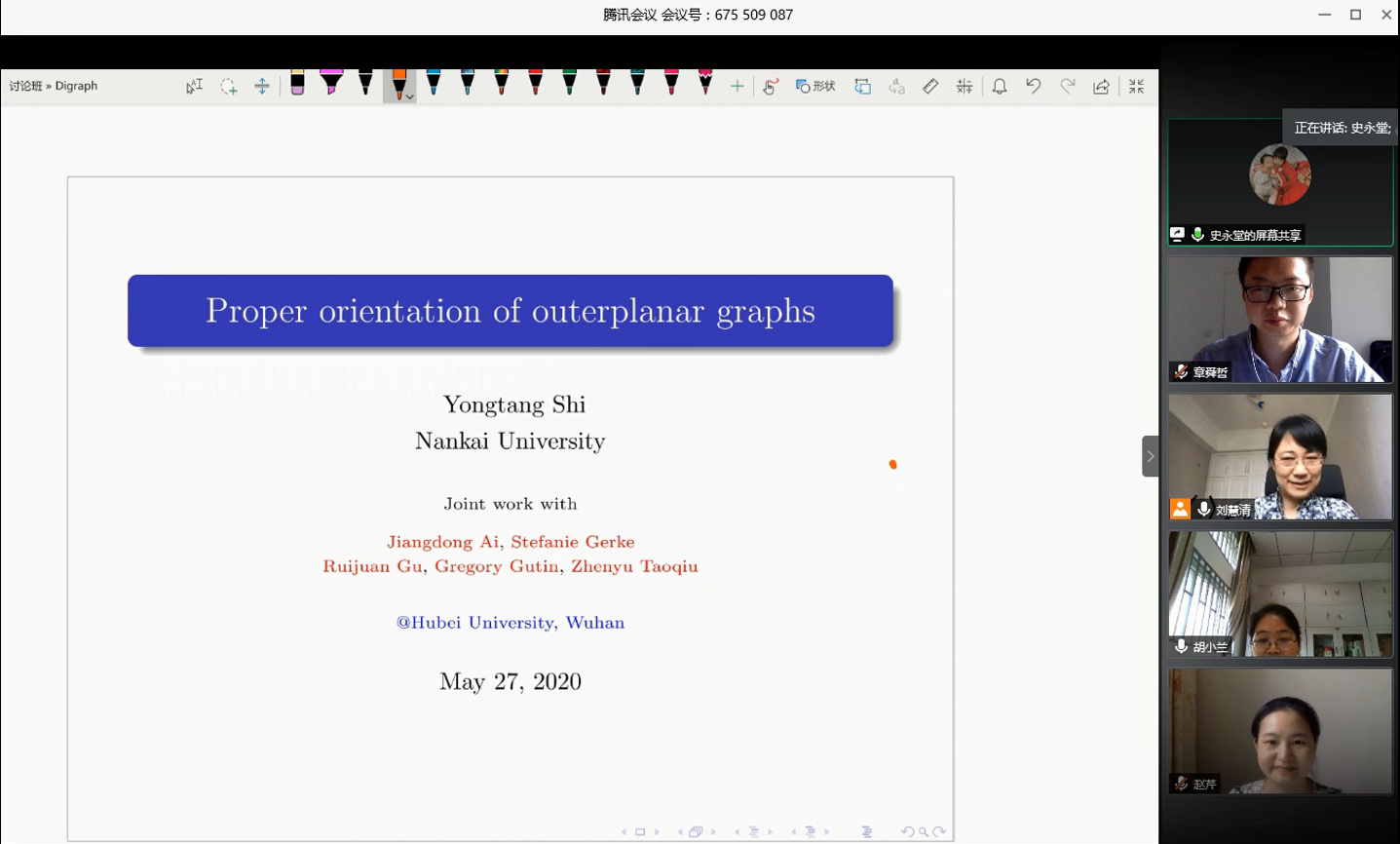 史永堂教授报告题目《Proper orientation of outerplanar graphs》,报告介绍了图的正常定向数,给出了不含三角形的外平面图的正常定向数紧的上界。相关结果已被图论方向顶级期刊《Journal of Graph Theory》接收。