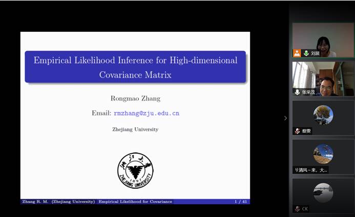 张荣茂教授报告的题目为《Empirical Likelihood Test for High Dimensional Covariance Matrices》,张茂荣教授介绍了对高维协方差矩阵的结构与相等性进行检验的经验似然比检验方法,并证明了该检验方法的渐近分布与维数无关,比文献中已有的其他许多检验方法更有效。
