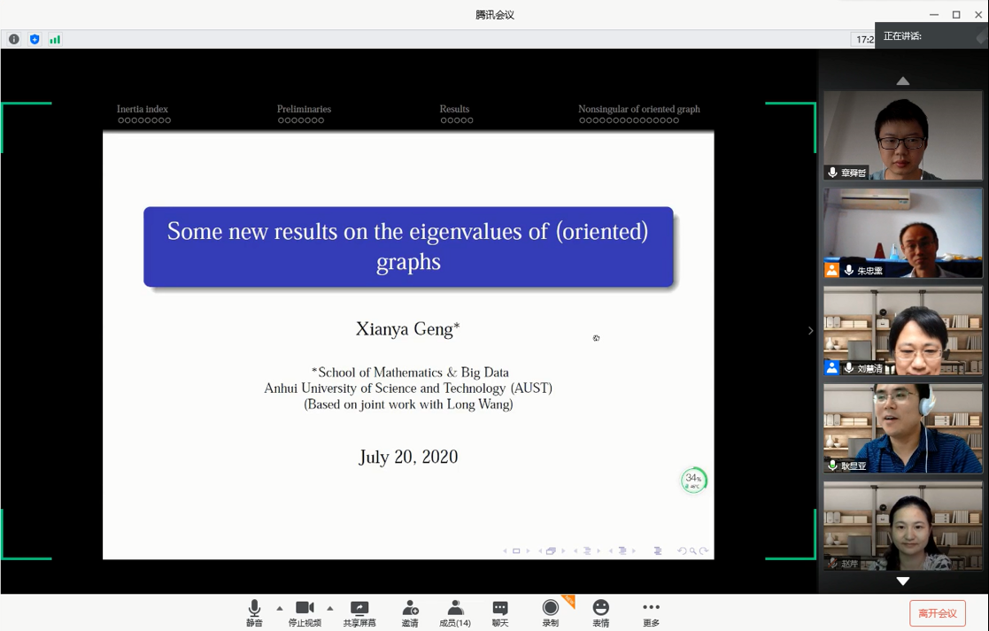 2020年7月20日上午, 安徽理工大学耿显亚教授应公司刘慧清教授邀请,为公司师生作线上学术报告,报告通过腾讯会议在线举行。会议由刘慧清教授主持,来自运筹学与控制论专业的教师、博士和硕士研究生14人参与了报告的听取、讨论。