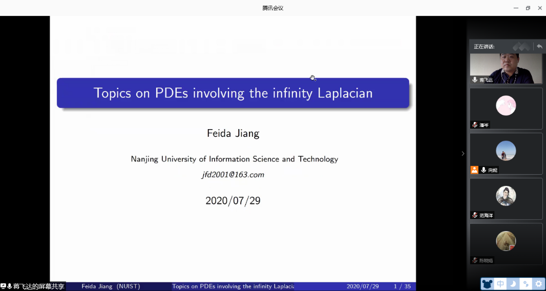2020年7月29日下午,南京信息工程大学蒋飞达教授应公司向妮教授邀请,为公司几何团队作线上学术报告,报告通过腾讯会议举行。会议由向妮教授主持,来自公司几何团队的教师、研究生10余人参与了报告的听取和讨论。