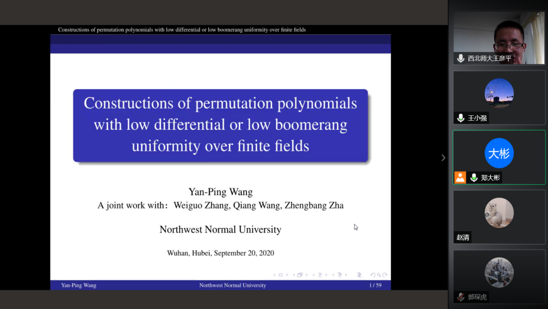 2020年9月20日下午, 西北师范大学王彦平讲师应公司郑大彬教授邀请,为公司密码编码学团队作线上学术报告,报告通过腾讯会议举行。会议由郑大彬教授主持,来自公司的编码密码学团队的教师、博士和硕士研究生10余人参与了报告的听取、讨论。