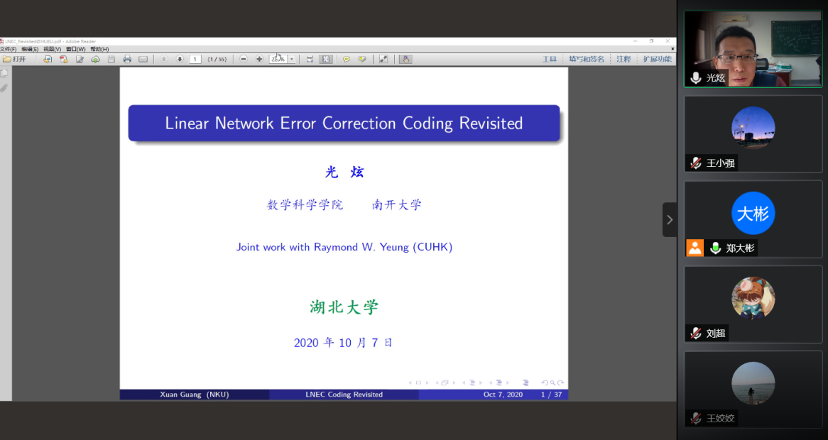 2020年10月7日下午, 南开大学光炫副教授应公司郑大彬教授邀请,为公司密码编码学团队作线上学术报告,报告通过腾讯会议举行。会议由郑大彬教授主持,来自公司的编码密码学团队的教师、博士和硕士研究生10余人参与了报告的听取、讨论。