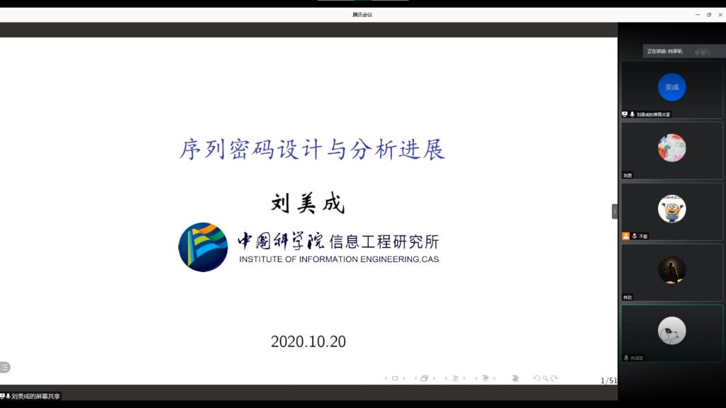 2020年10月20日下午,中国科公司信息工程研究所副研究员刘美成应公司向泽军邀请为公司密码学团队作线上学术报告,报告通过腾讯会议举行,会议由向泽军主持。来自公司密码学团队的相关教师、博士和硕士研究生10余人参与了报告的听取、讨论。