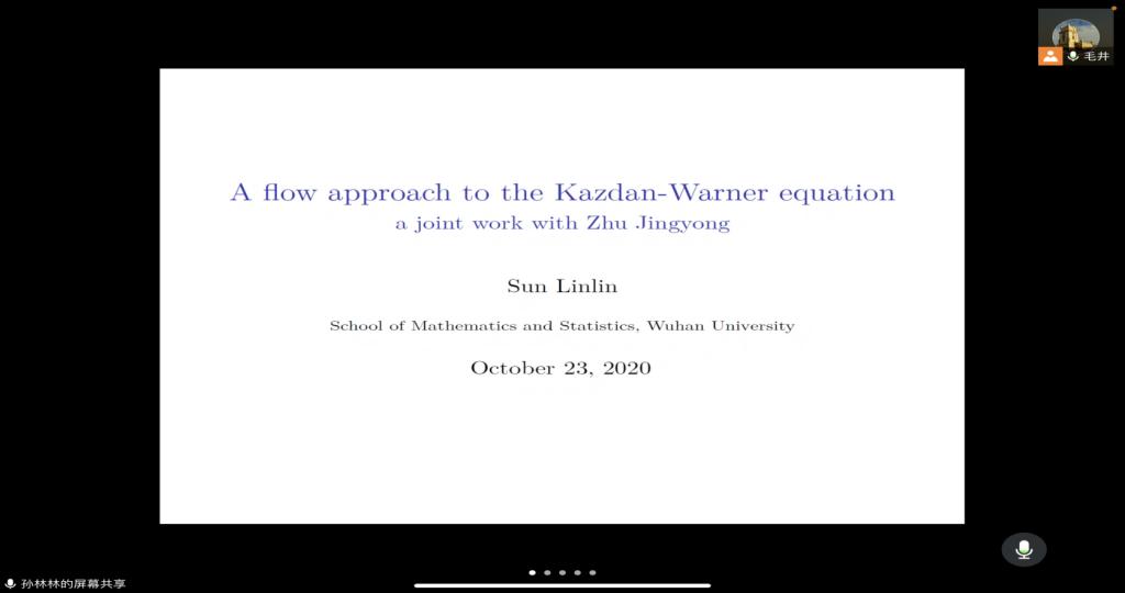 2020年10月的23日下午,武汉大学孙林林教授应邀为公司相关专业的教师与研究生做了题为“A flow approach to the Kazdan-Warner equation”的线上学术报告。