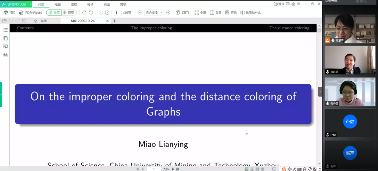苗连英教授的报告题目是《On the improper coloring and the distance coloring of Graphs》。苗连英教授从基础的概念开始讲,介绍了improper染色和distance染色的相关问题。报告十分精彩,老师和同学们对该问题很有兴趣。