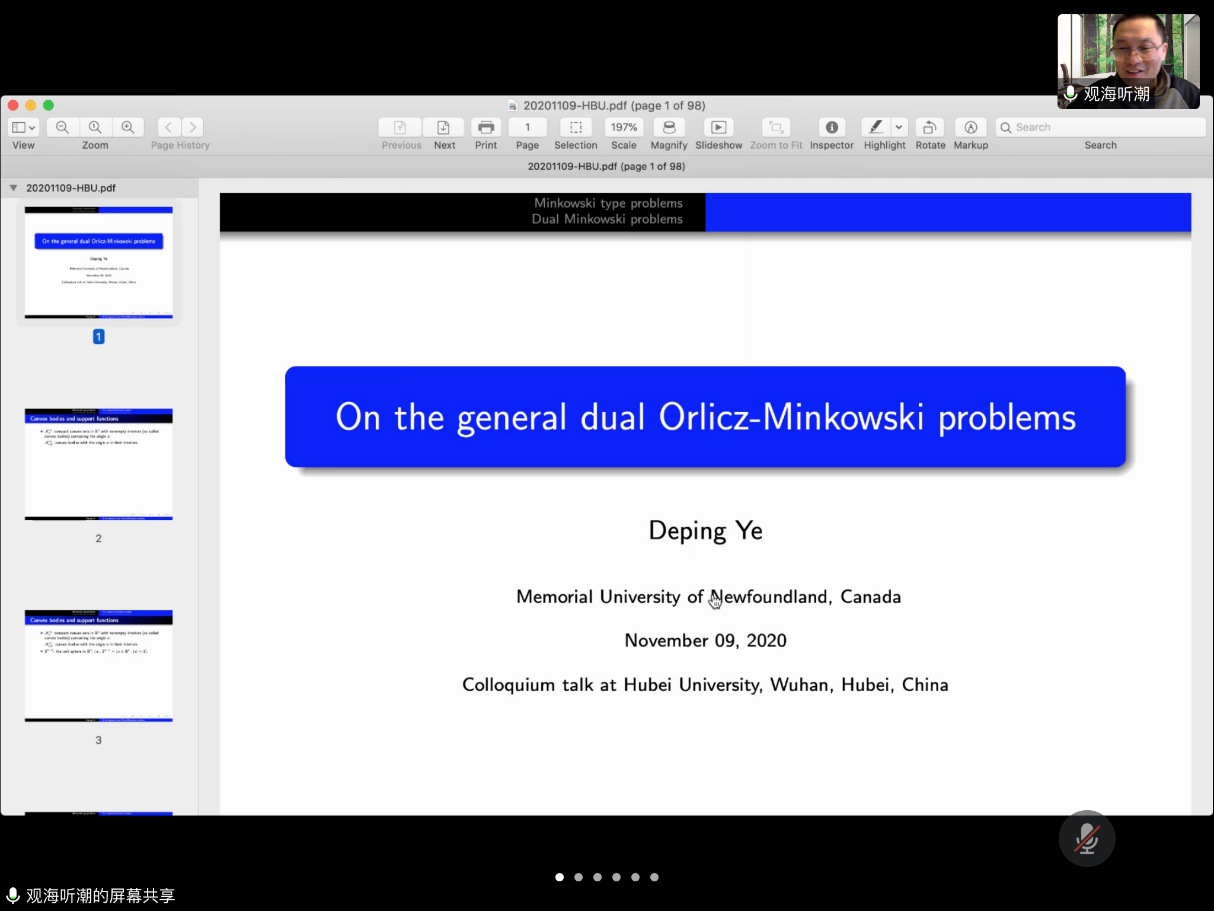 叶德平教授报告题目为《On the general dual Orlicz-Minkowski problems》,报告中叶教授介绍了在一般的对偶Orlicz-Minkowski问题上的最新贡献,还着重解释了解决该问题的动机和解决方案。