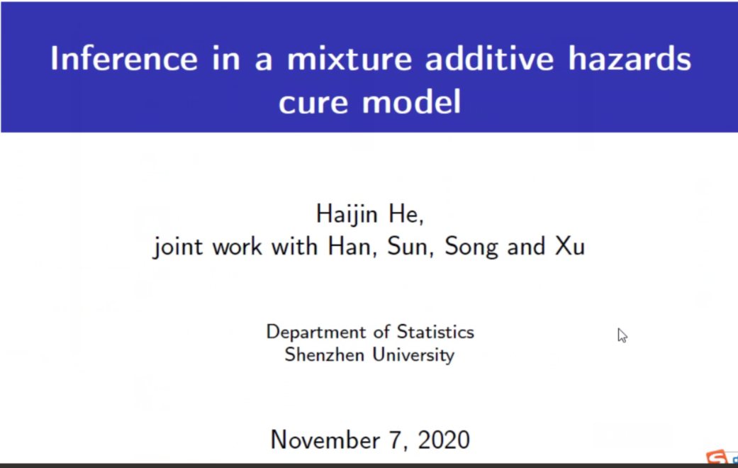 何海金教授报告题目为《Inference in a mixture additive hazards cure model》,主要提出了一个针对含有治愈率的生存数据的混合加性风险(AH)治愈模型,该模型将疾病治愈患者比例的logistic回归模型和未治愈患者的AH模型结合起来,并建立参数的广义估计方程,给出了其估计量的渐近性质。此外,通过提出的模型检查方法,来评估模型的充分性,利用模拟研究对该方法的有限样本性能进行了评价。最后,通过一个实证数据来验证所提出的方法。
