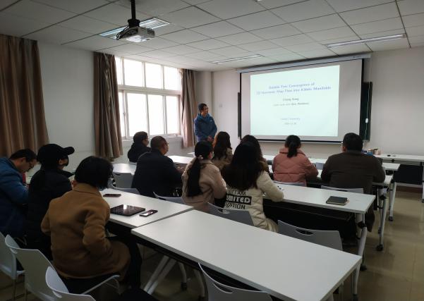 宋翀教授报告的题目为《Finite-time singularity of 2-d harmonic map flow into Kahler manifolds》,在这次报告中宋翀教授首先给我们简单介绍了一下这方面的一些重要的进展,然后给我们介绍了一些关于二维调和映射流的一些概念并用图解的方式加深我们对内容的理解,然后提出了他所做的问题和最后的研究成果,最后还给我们详细的介绍了他的证明过程。