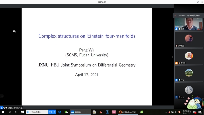 2021年4月17日下午,复旦大学上海数学中心吴鹏教授应邀为公司相关专业的教师与研究生做了题为“Complex structures on Einstein four-mainifolds”的线上学术报告。