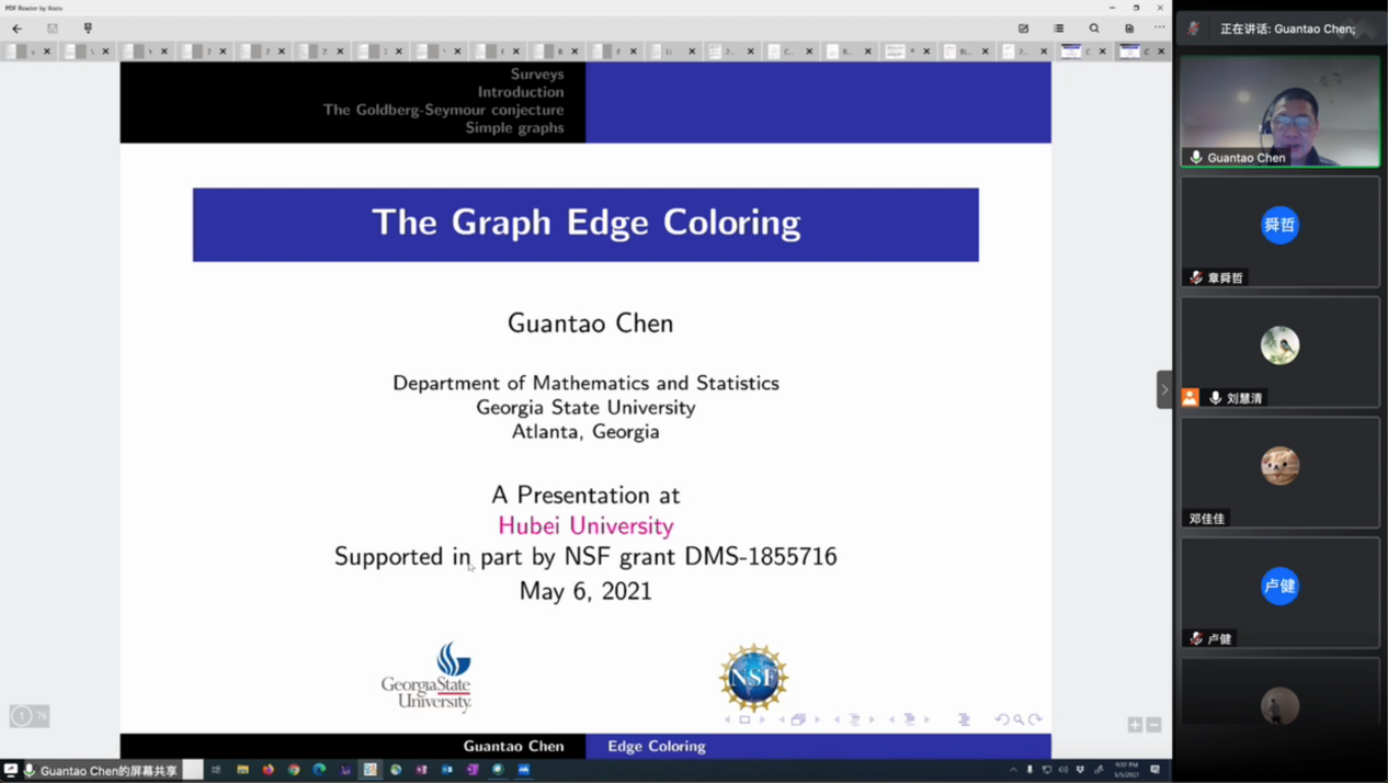 陈冠涛教授的报告题目是《The Graph Edge Coloring》。陈冠涛教授从基础的相关概念开始讲,介绍了图论中边染色的相关问题以及猜想。报告十分精彩,老师和同学们对该问题很有兴趣。