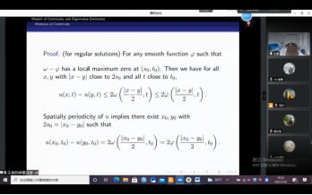 报告中,王奎老师首先介绍了连续性模的概念,举了相应的例子,其次,介绍了第一非零特征值下界估计研究的发展情况,着重讲解了近期他本人与合作者利用连续性模技巧得到的若干特征值下界估计的结论。