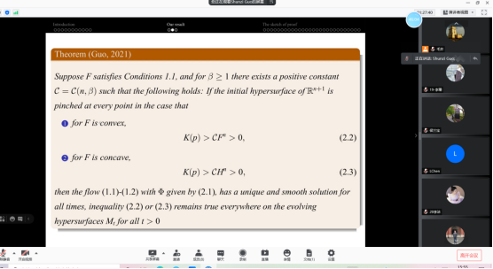 报告中,郭顺滋老师介绍了度为1的齐次曲率函数的保混合体积流,详细说明了该问题的背景以及他近期的研究进展,介绍了该流的收敛性等相关结论的证明,并就该问题在几何不等式方面的应用同参会师生进行了讨论。参会师生通过此次讲座,对保混合体积流的相关问题有了一定的认识,丰富了自身的知识。