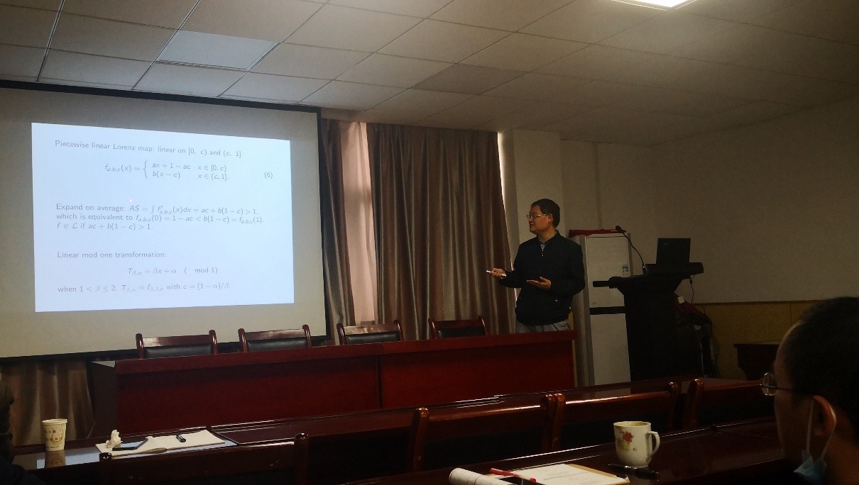 2021年10月8日上午,武汉理工大学数学科学研究中心副主任丁义明教授应邀在beat365官网登录中文201会议室为公司相关研究方向师生作了题为“Parameterization of expansive Lorenz maps”的学术报告。