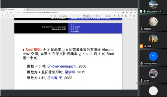 2022年9月27日上午,北京师范大学王雨生教授应邀为公司相关专业教师与研究生做了题为“曲率有下界ALEXANDROV几何的基本概念和问题”的线上学术报告。