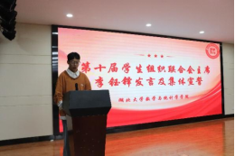 第十届学联会主席李钰铎发言,表明接下来的工作计划及决心:一是明确定位,健全机制;二是加强沟通,凝心聚力;三是弘扬传统,开拓创新。希望每一位同学脚踏实地,团结一致,勤思考,肯努力,共同书写学联会新的篇章,并带领第十届学联会全体成员、现任班长及团支书集体宣誓《员工干部自律公约》。