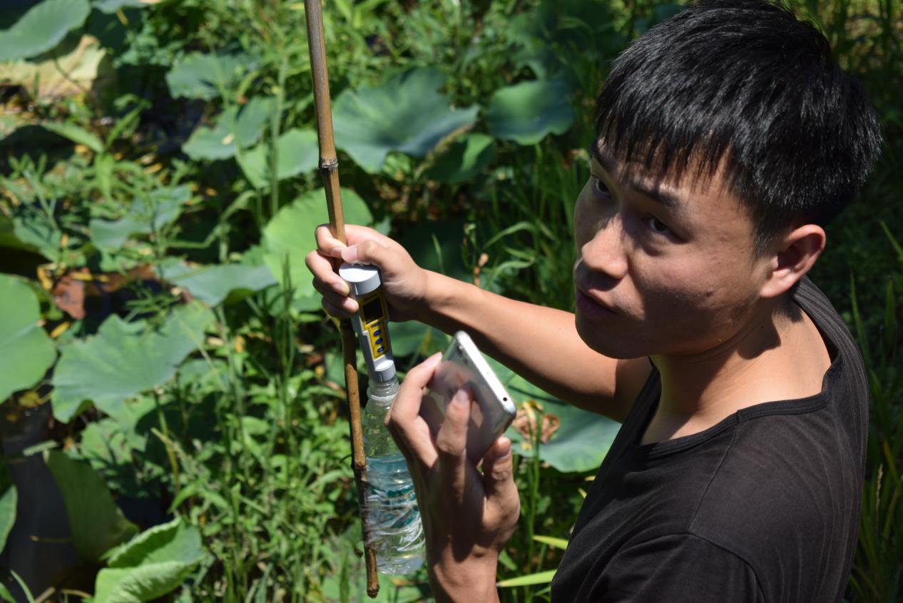 图为莲花荡一湖边正在进行水质勘测工作的技术人员。
