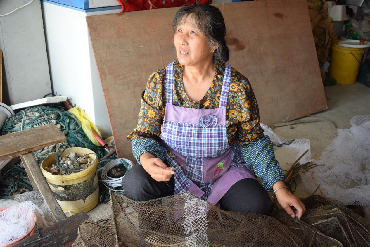 图为村民在缝补渔网。2013年莲花荡兴建新村,部分村民土地被征收,转向从事其他农产业。