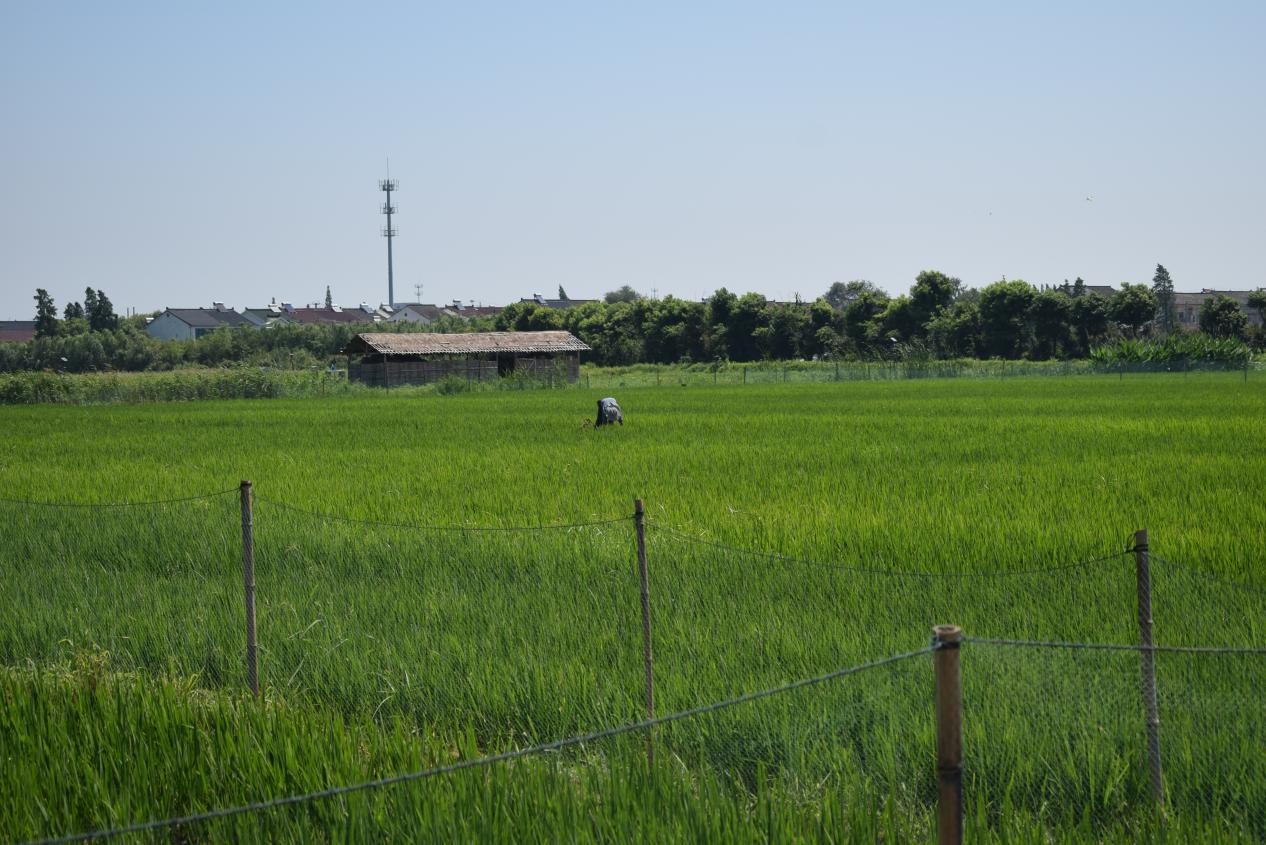 图为莲花荡示范大田(智慧农田)里正在辛勤劳作的农民。莲花荡示范大田共300亩,运用物联网设备和技术种植有机大米。