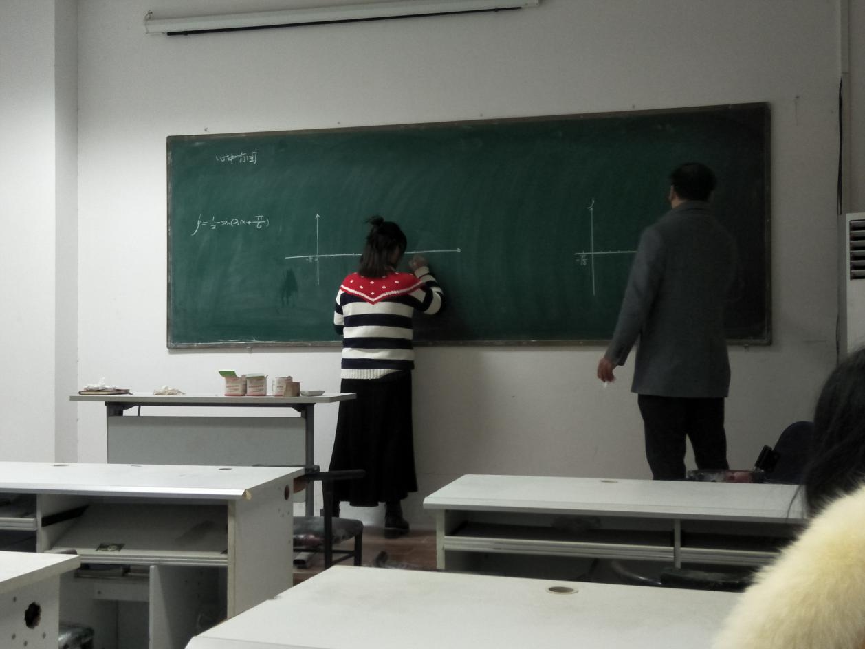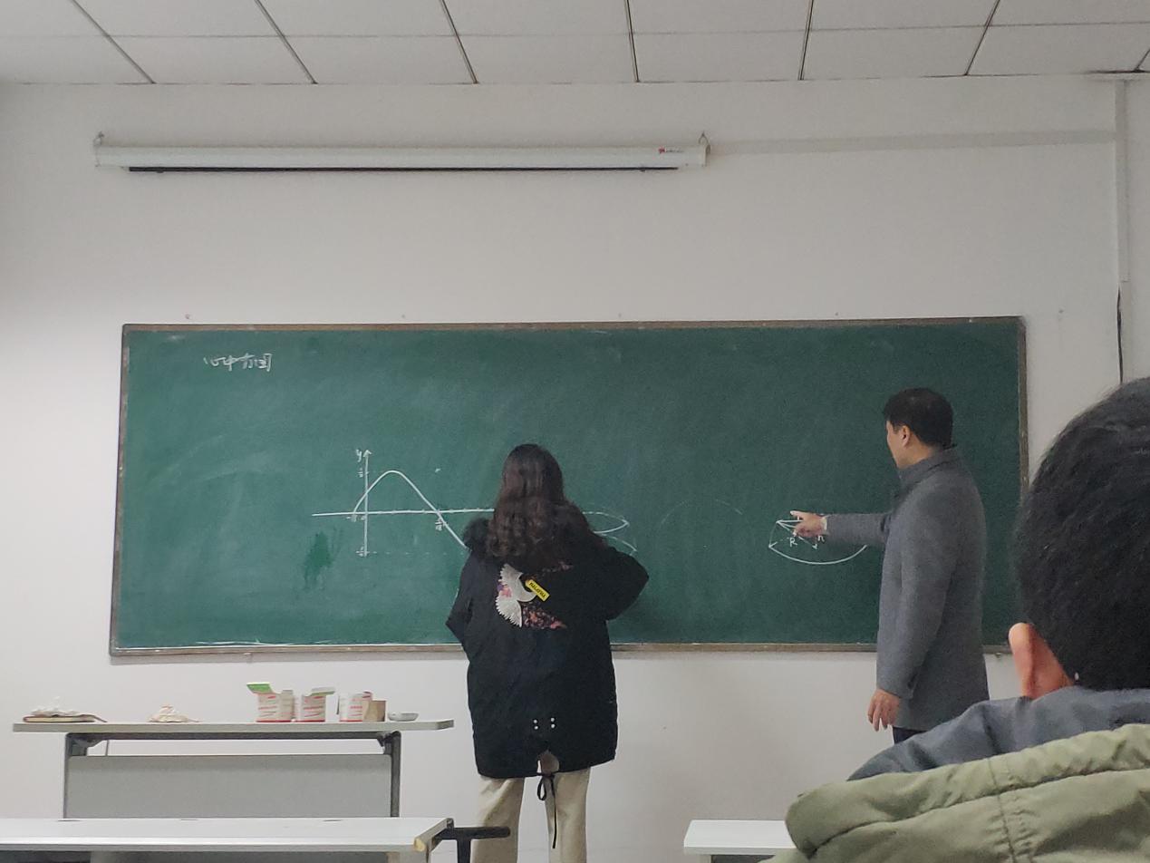当李老师以画三角函数线为例向同学们展示徒手做圆的本领时,精湛的作图功底赢得了同学们的阵阵掌声。他指出,徒手做圆考验的是教师的基本功,做圆时半径不能选太大,粉笔头的初始位置指向5点钟方向。他让同学现场演示并耐心指导。
