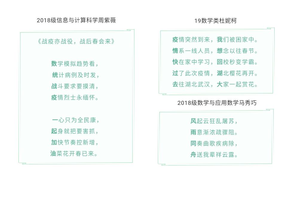 为了表达对所有抗疫人的感激之情以及对这场战役必胜的决心,同时将我国优秀的传统文化传承下去,beat365官网登录中文特于2020年3月9日举办了为期10天的“诗藏我心”藏头诗比赛。