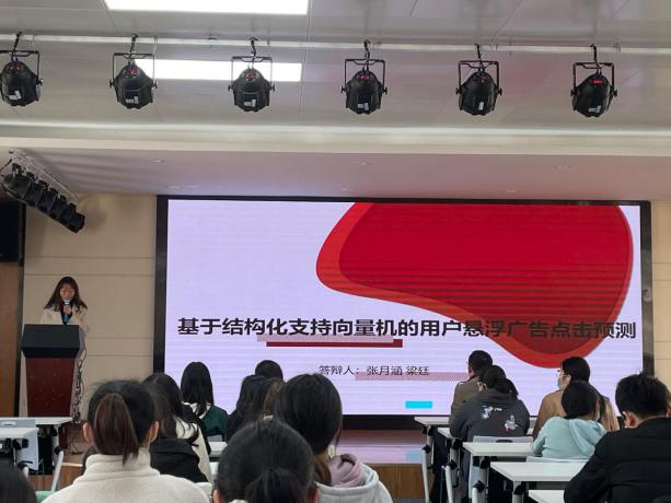 第三组是研究生带来的基于结构化支持向量机的用户悬浮广告点击预测,主讲人张月涵介绍了项目的基本情况;随后,邹斌教授对其6万条用户数据提出大数据时代6万条数据是否他太少的疑问;另对其结论产生质疑,建议应该有对比。