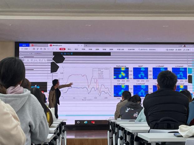 首先进行答辩的是自然科学类——基于极大似然估计的高光谱非负矩阵分解解混方法,主讲人蒋芹,讲解完后,邹斌教授对其进行点评讲解,指出他们应在对高光谱怎么来的以及在ppt上将最优谱进行标记说明,让结果更显眼上进行修改。