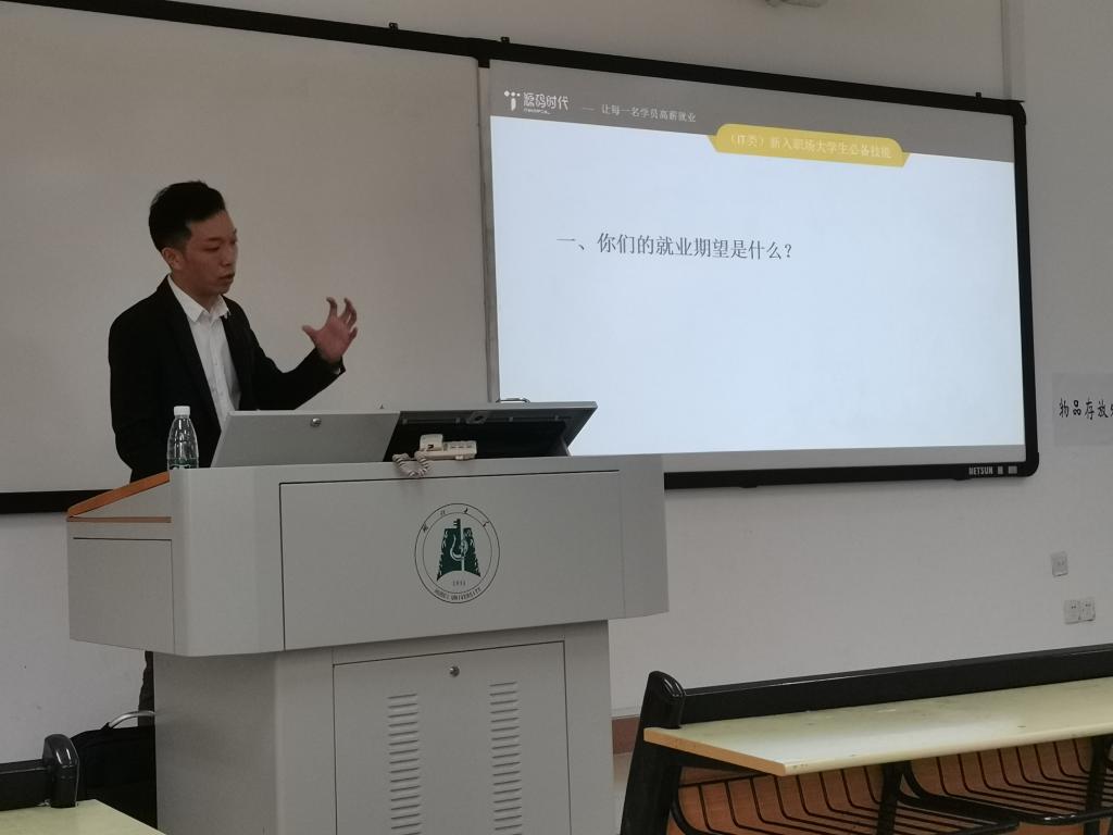 2021年4月14日下午,beat365官网登录中文邀请源码时代教育集团华中区董事长——胡昶晹来校进行宣讲。在教4-311,胡昶晹以“后疫情时代IT类别新入职场老员工的必备技能”为题向公司信科专业的同学们介绍就业所应该具备的知识和技能,以助同学们能更好地在就业浪潮中找准自己的方向,得到一份理想的工作。