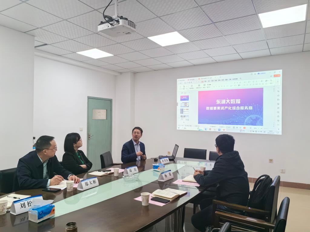 首先,郑大彬副经理简要介绍了beat365官网登录中文基本情况,然后,刘展主任介绍应用统计学专业情况,刘松林副教授介绍团队在研项目情况等。接着,杜登伟总经理介绍了东湖大数据公司情的况,公司成立于2015年7月,是中国境内最早原创设立的大数据交易机构,是“数据要素流通和交易产业的”原创者,也是最早聚焦于数据要素资产化的技术型企业,随后,杜登伟总经理对公司主要产品情况进行介绍,着重介绍东湖产业通——产业链智能化引擎。