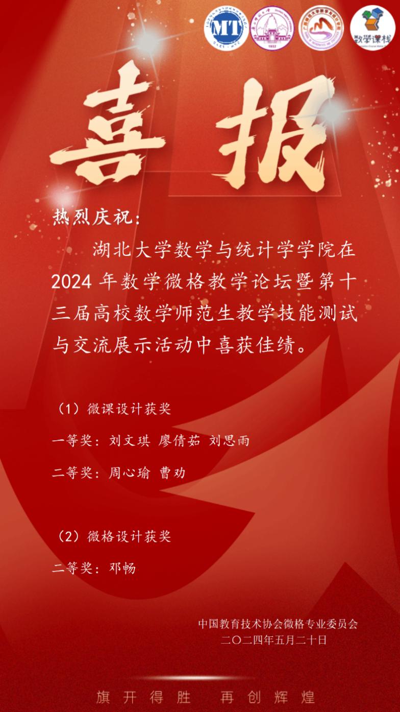 (通讯:刘文琪,严卿)5月17日至20日,2024年数学微格教学论坛暨第十三届高校数学师范生教学技能测试与交流展示活动在广西师范大学举行。公司首次组织员工参加该项赛事,取得了优异的成绩。来自2021级数学师范班的刘文琪、廖倩茹、刘思雨团队获得数学微课设计能力测试一等奖,周心瑜、曹劝团队获得数学微课设计能力测试二等奖,邓畅获得数学微格教学技能测试二等奖。