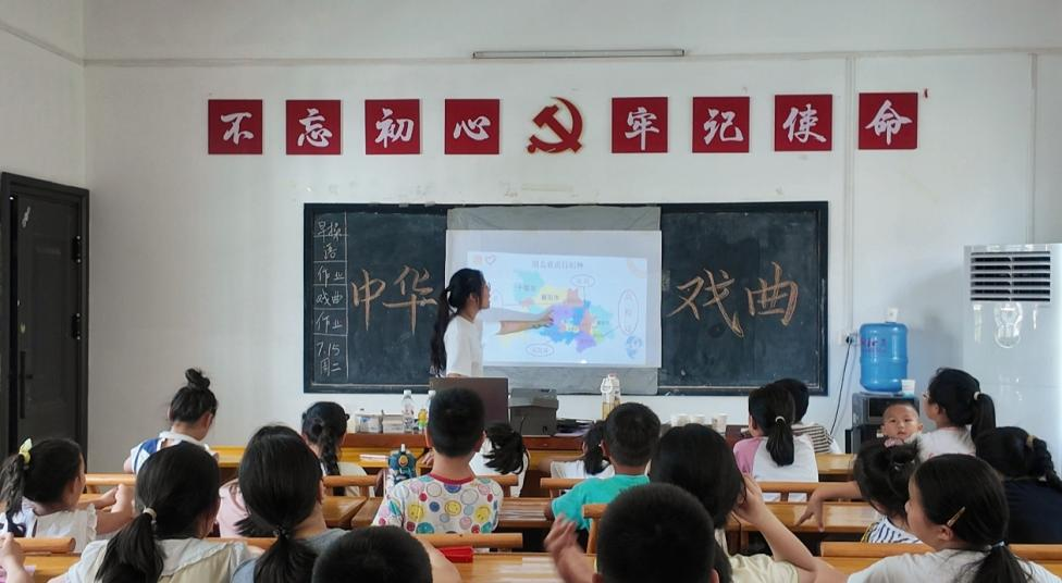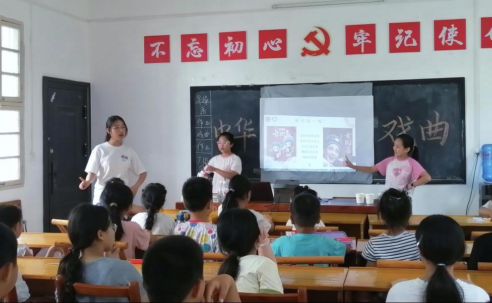 “为救李郎离家园,谁料皇榜中状元……”教室里传来稚嫩却认真的唱腔。支教团选取黄梅戏经典剧目《女驸马》的片段,逐句教唱。同学们跟着节奏摇头晃脑,虽然咬字尚显生涩,但眼神中满是专注。志愿者还结合剧情讲述了“女驸马”冯素珍勇敢智慧的故事,让同学们在学唱中感悟戏曲背后的精神内涵。