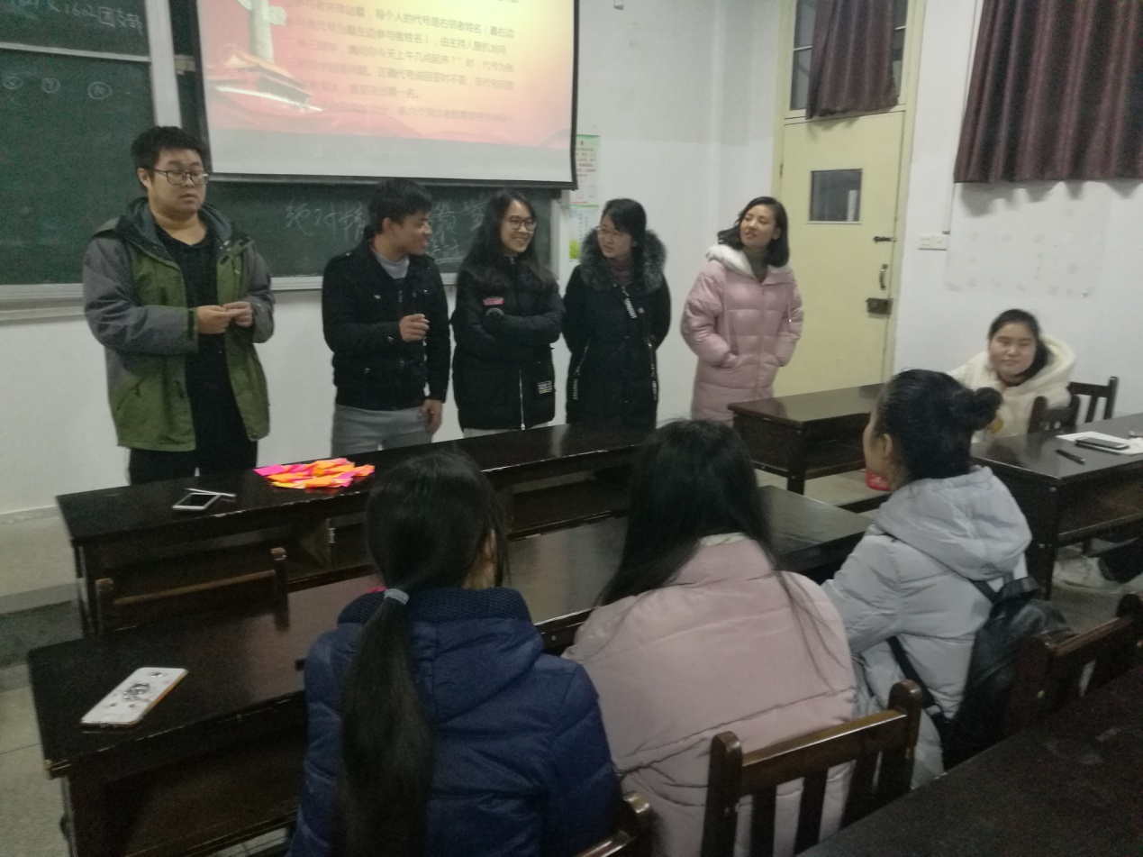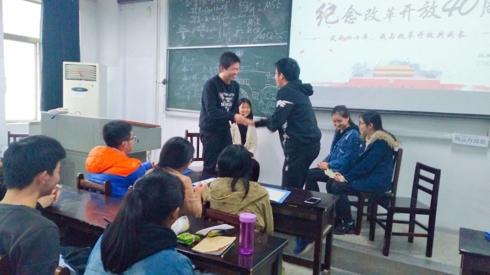 应用统计学1702团支部在三号教学楼603教室举办了庆祝改革开放四十周年系列主题团日活动“风雨四十年,我与改革开放共成长”。此次活动以团支书发言、团支部成员小组展示为主要形式,主要目的在于促进团支部成员了解、并切身体会改革开放与我们的密切关系,以此帮助团支部成员在新的历史起点上体会改革开放的伟大、吸取改革开放的经验教训,与改革开放一同进步。本次活动分为五个小组进行了展示,展示内容丰富多样、紧扣主题。有融合了小品表演的PPT展示,有多语言版的诗歌朗诵,也有幽默风趣的访谈节目。五个小组精心准备,为大家呈现了意想不到的精彩展示,活动气氛一度高涨。