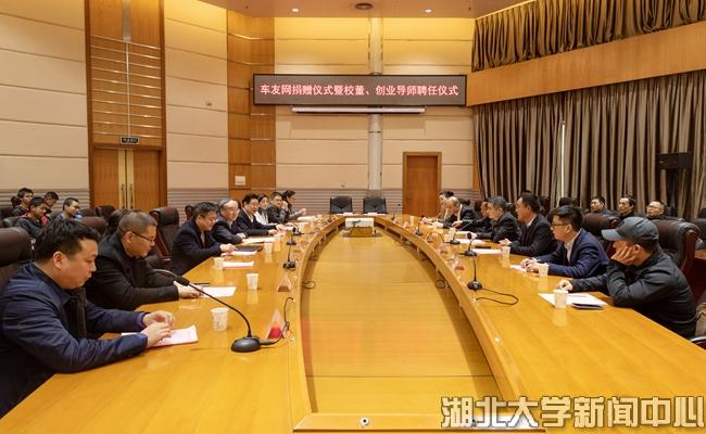 车友网董事长邢光磊、执行总经理王琨、副总经理乐睦,武汉华银百汇科技有限公司总经理张新伟,武汉先歌科技有限公司董事长柳海涛等企业嘉宾,beat365官网登录中文董事长谢红星,公司办公室、宣传部、人才招聘处、合作发展处负责人,beat365官网登录中文师生代表出席捐赠聘任仪式。副董事长钱建国主持仪式。