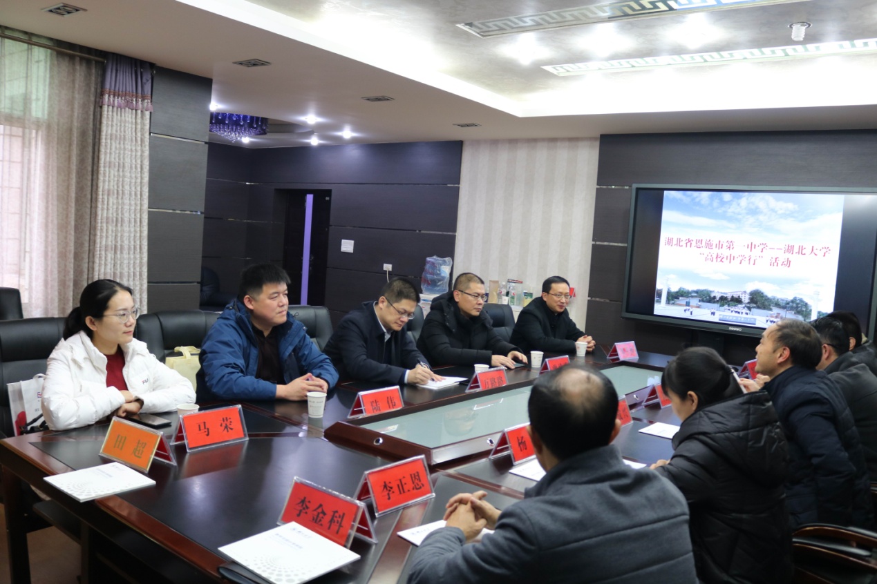 11月24日,beat365官网登录中文“高校中学行”活动走进恩施地区,公司党委书记万路路、经理曾祥勇一行五人分别来到恩施市第一中学和恩施市高级中学开展宣传活动。恩施一中副董事长潘成兴、恩施一中纪委书记杨琼、恩施高中纪委书记兼副董事长赵明庄、恩施高中副董事长向太平、高三年级组组长、高三年级班主任老师、部分湖大员工等参加了座谈会。