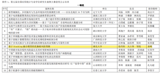 8月19日,2022第五届全国应用统计专业学位研究生案例大赛结果公布,公司beat365官网登录中文师生荣获全国一等奖1项、二等奖2项、三等奖2项,其中由姜峰老师指导,徐丹阳、凡士伟、邹悦完成的案例作品《基于Stacking融合模型的乳腺癌风险预测》荣获全国一等奖。