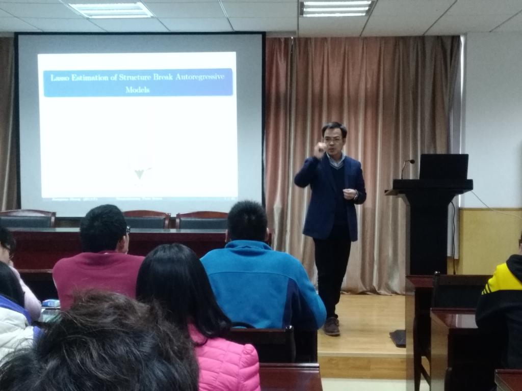 张教授首先以股票为例,时间跨度变长,股票的数据结构就会发生变化,引出报告主题——“结构变化模型”。随后讲述结构变化模型在当今社会的应用,比如气候变化、医学影像、疾病控制、PM2.5影响度等,强调研究此模型的重要意义。紧接着说明确定此模型过程中存在的难题,如何估计系数、如何确定临界情况、如何进行时间分段。然后提出解决方法,变点模型和门限回归模型相结合,衍生出一种崭新的结构变化模型,为方便在场师生理解,板书进行公式推导。最后进行模型有效性的验证,结果显示软件运行速度仅有20s,AIC的值也很小,各方面均比现有其他模型更有效。